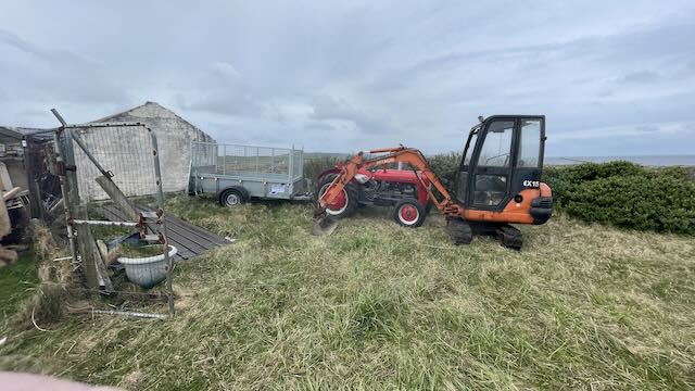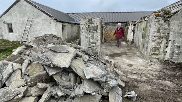 Rather than “playing in the workshop” we’ve been doing some fairly major building work. There is an old semi-derelict shed built onto the back of our house that had a stone roof with holes in it and some woodworm-damaged trusses. It also had a damaged stone wall in the middle to make it into a two-room shed. Actually, according to the “Fae Quoy to Castle” book documenting the properties of Westray, way back this was a dwelling built onto the house by one of the original occupant’s sons somewhere around 1890! The front shed wall was also largely missing.