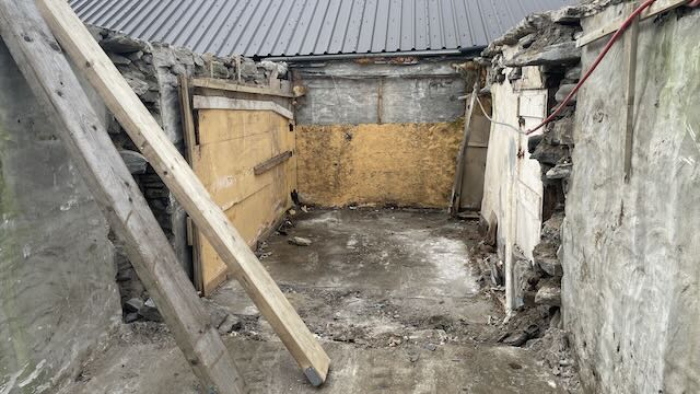 We decided to completely remove the roof and the middle wall, and cean up the largely missing front wall and then make good.
