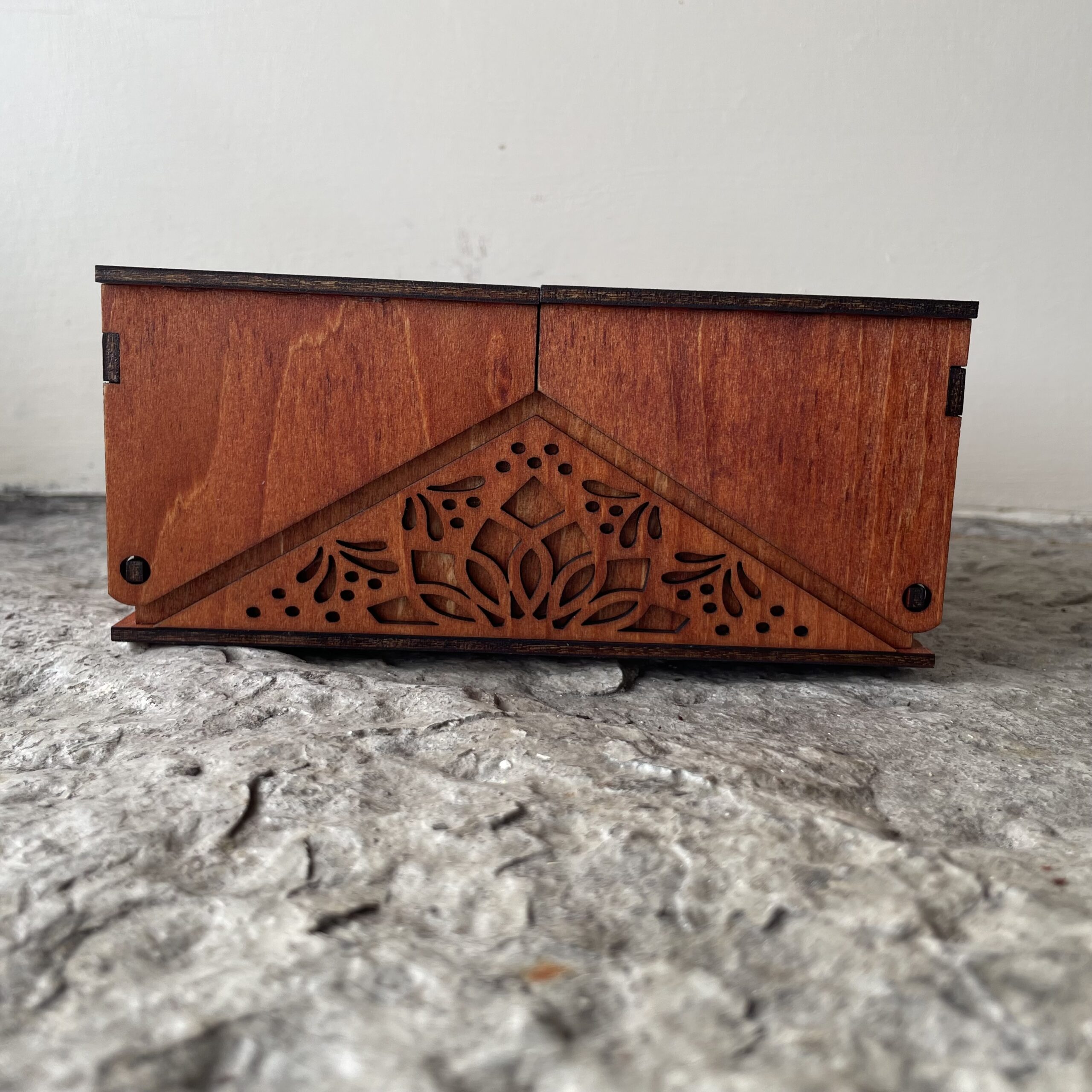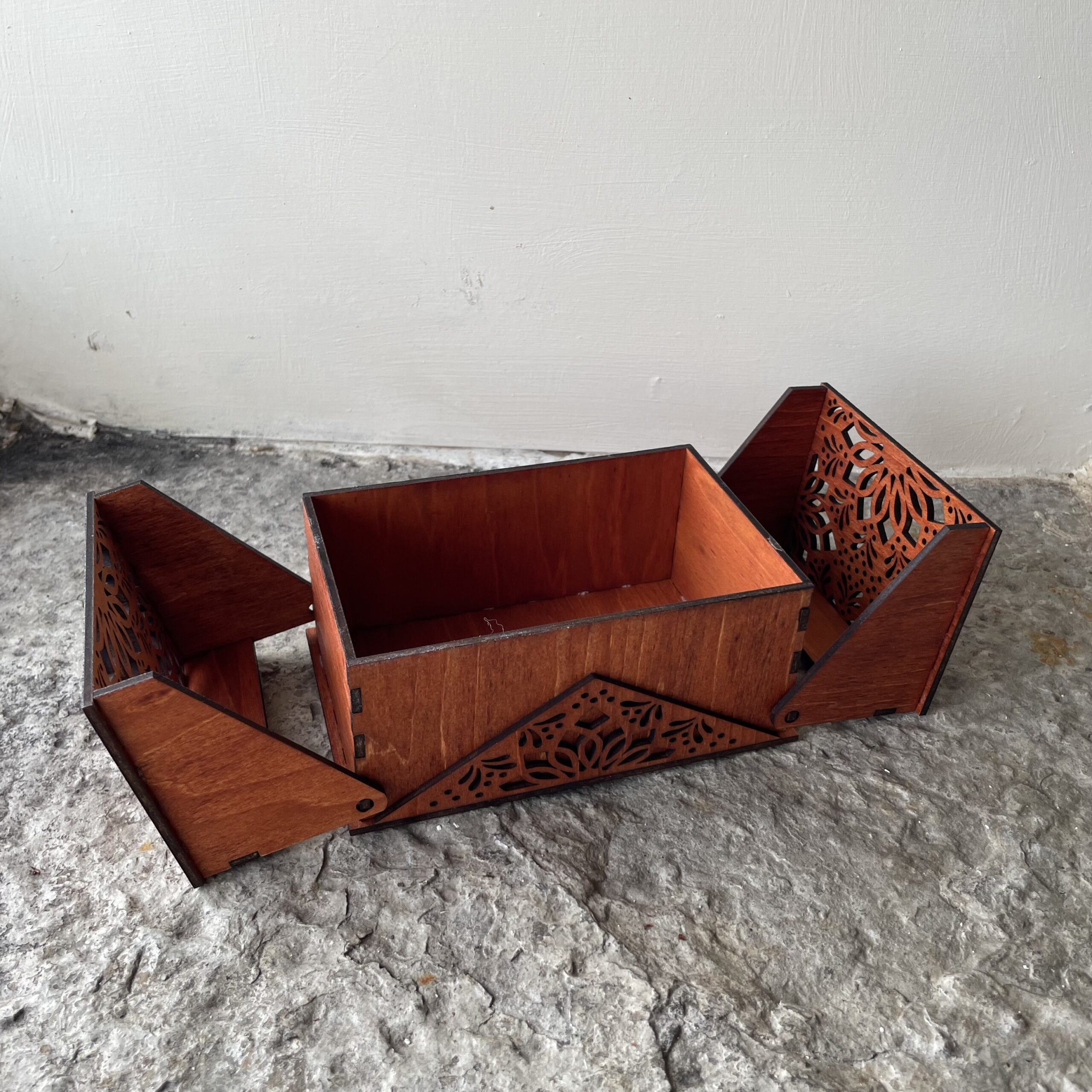 A laser cut ornamental box with cantilever style lids.
